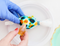 - After putting on your protective gloves (trust us, you don’t want your hands to get dyed), use the food coloring to directly blot small drops of color onto the egg. Keep in mind, the color will spread as it touches the wet surface, so less is best. You can always go back to add more!