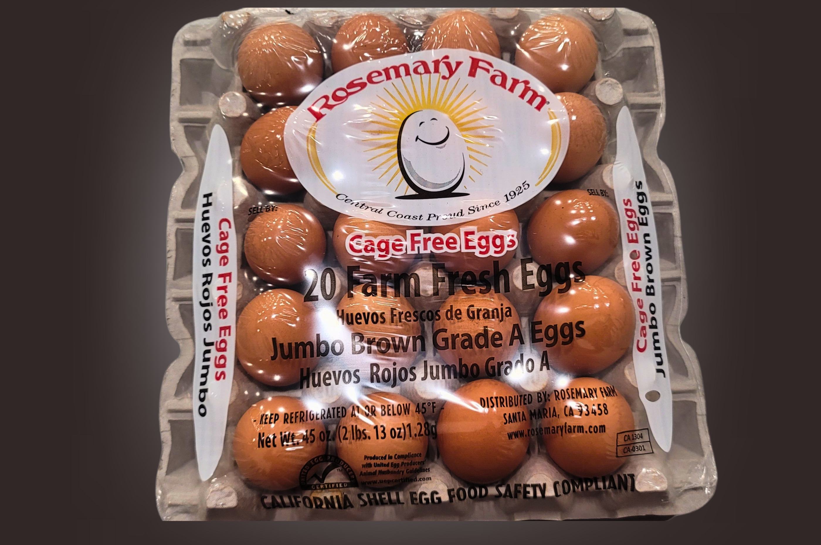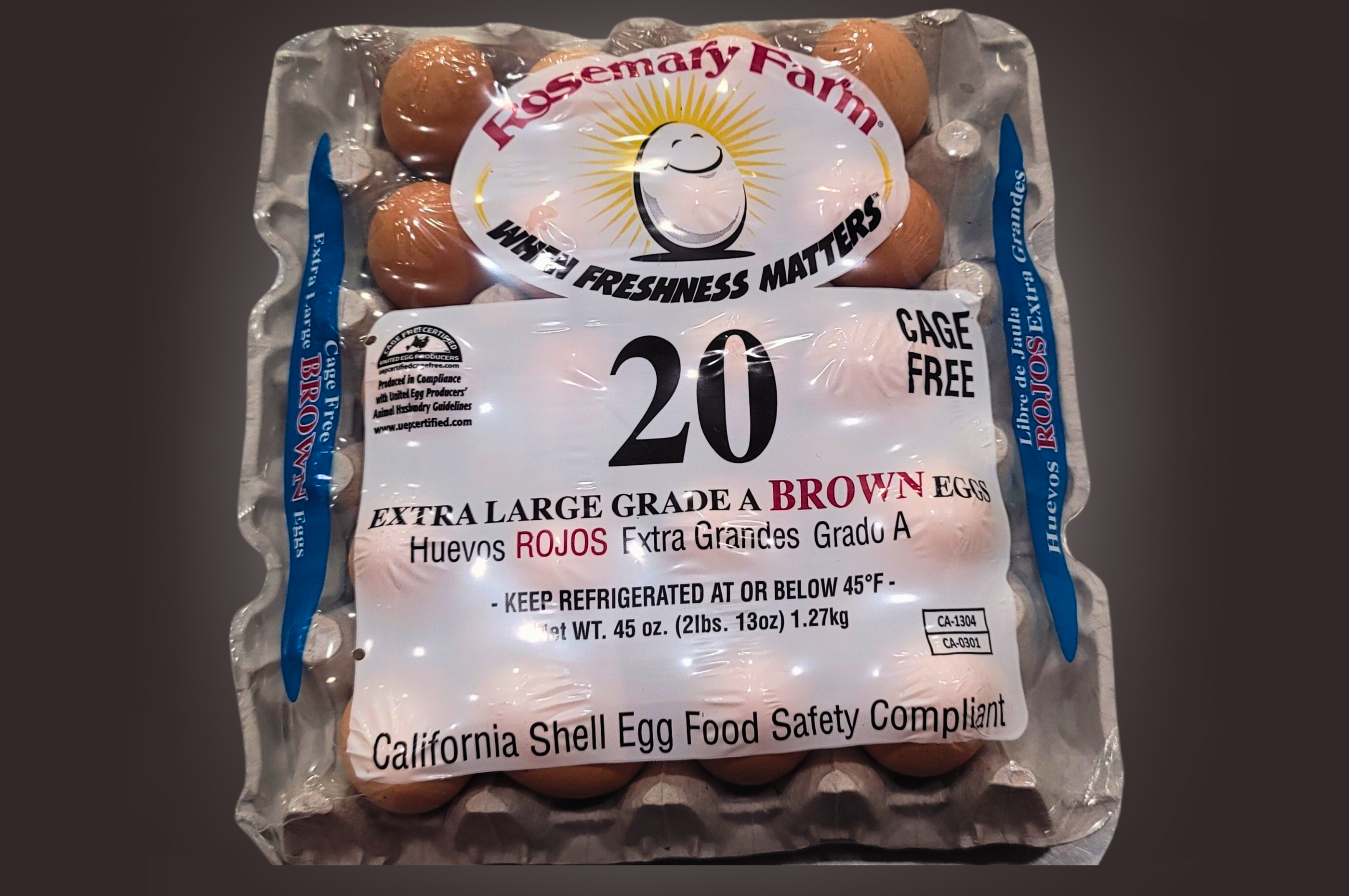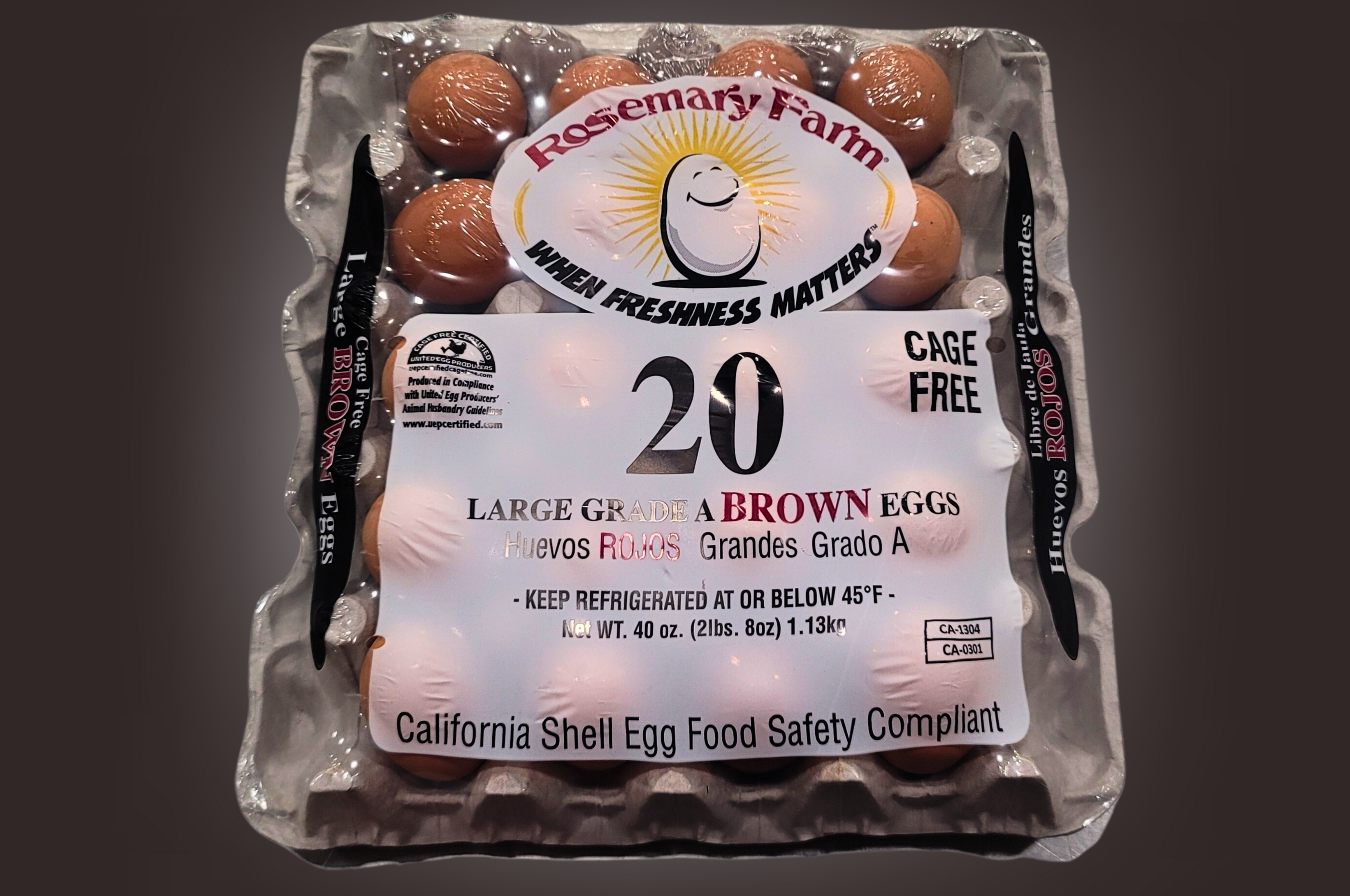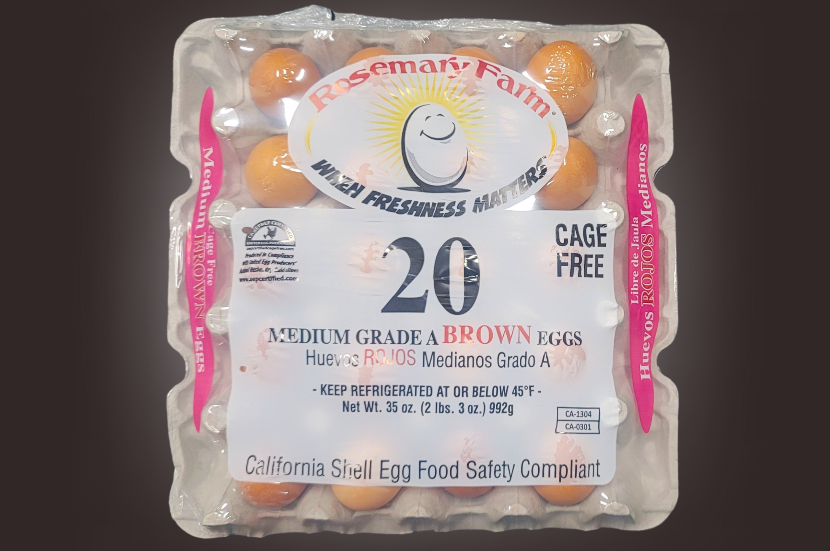 Our cage-free brown eggs are available in medium, large, extra large, and jumbo sizes. You can purchase them in overwrap or pulp packaging in counts of 12, 20, and 30 eggs.