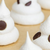 5. Place a dot of meringue underneath all 4 corners of parchment paper so it adheres to the baking sheet. Create meringue ghosts by piping 3 circular forms one on top of the other, like a snowman. Gently press chocolate chips “eyes” into meringues.